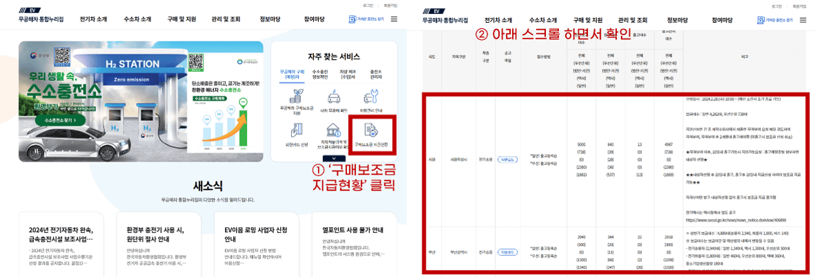 무공해차 통합누리집이라는 전기차 관련 전용 홈페이지 통해 보조금 지급 현황을 알 수 있습니다.