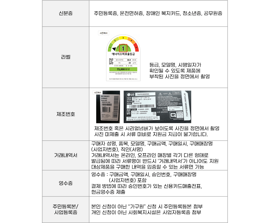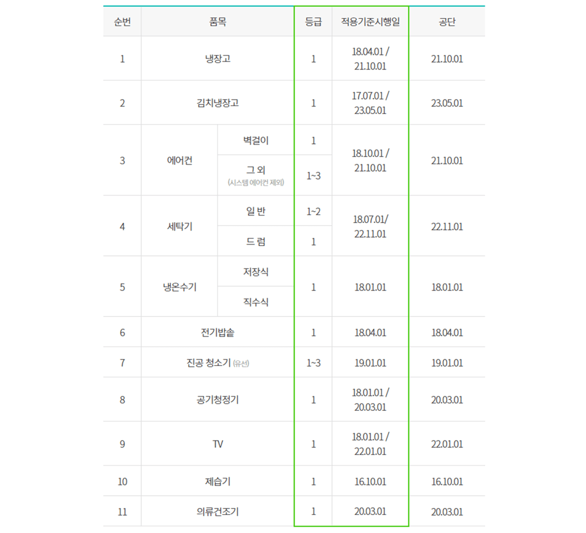 지원되는 품목은 총 11개이며 에너지효율 등급과 적용기준시행일 기준을 충족시켜야 합니다.