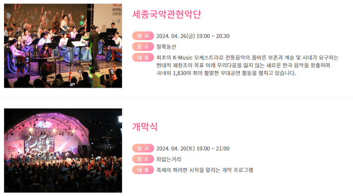 그중에서도 철쭉 축제를 알리는 개막식은 4월 20일 오후 7시에 연다고 합니다.