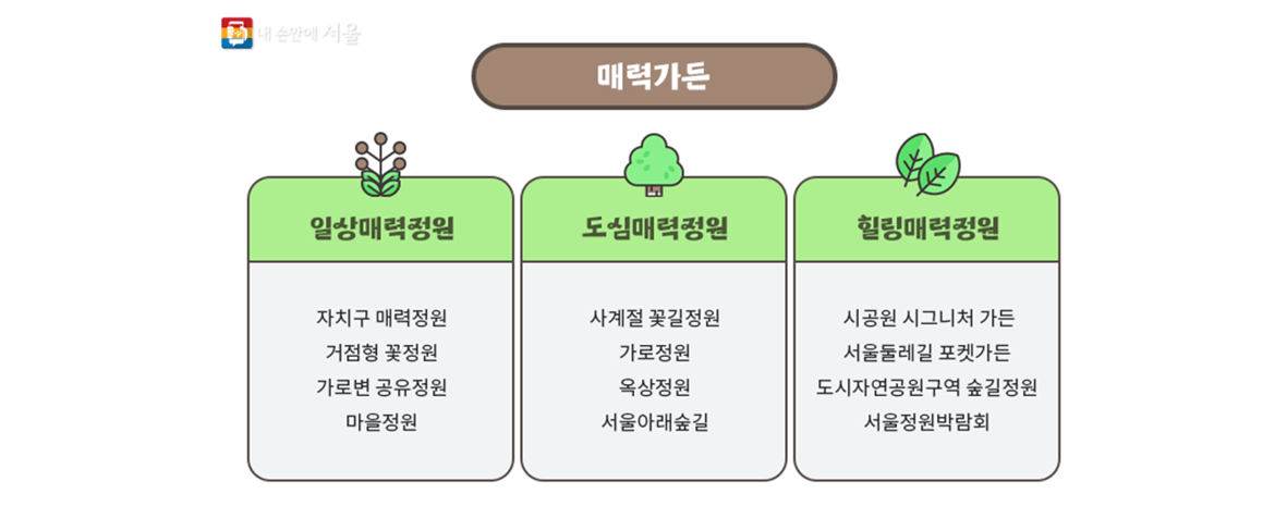 아래와 같이 일상매력정원, 도심매력정원, 힐링매력정원으로 구분하여 정원 조성을 할 계획입니다.