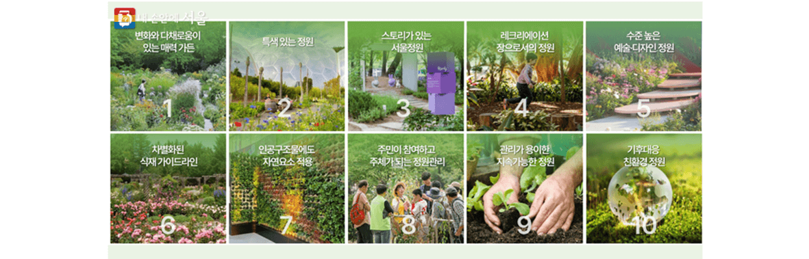 서울시에서는 예술적 정원조성을 새로 추진 중에 있으며, 매력가든 10대 원칙을 제시하고 있습니다.