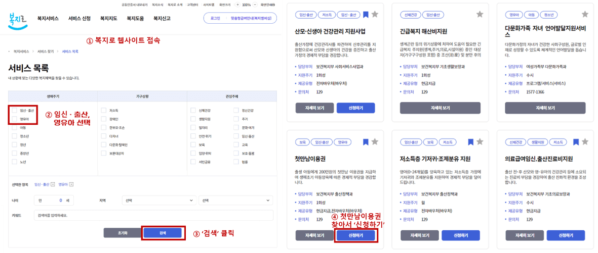 복지로 로그인 > 서비스 신청 > 복지서비스 신청 > 복지급여 신청 > 임신출산 > 첫만남이용권